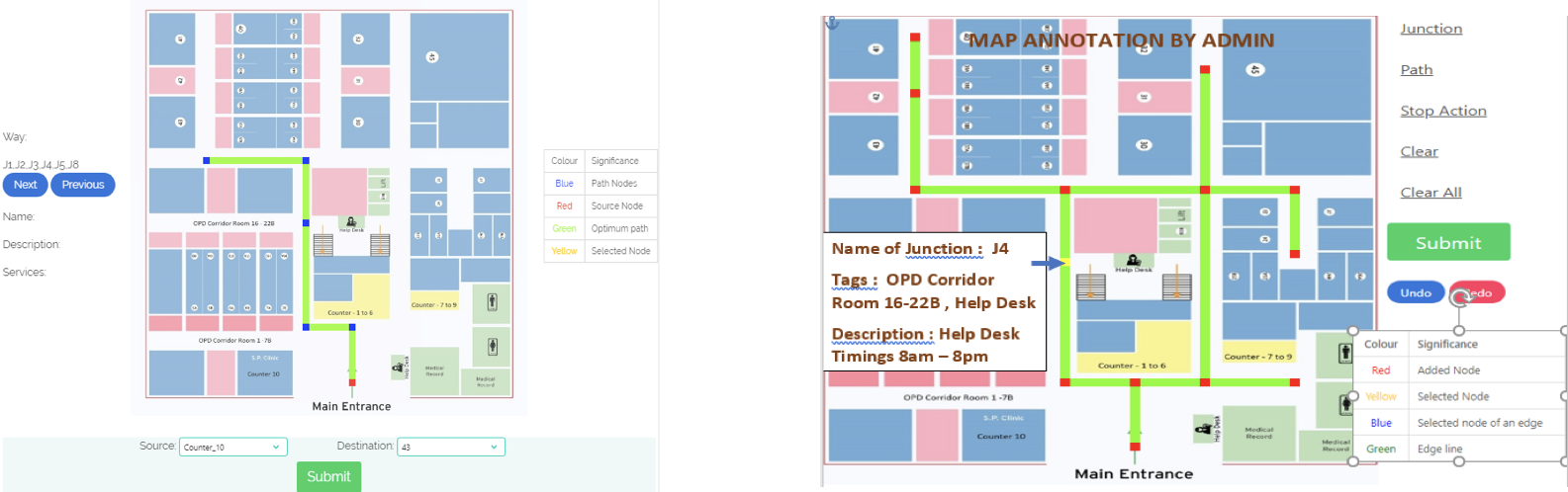 After uploading the map, he has the option to see or annotate any map he has uploaded. He can also the various versions of each map ( current , previous and older) . Each map asks for authentication via password before submitting. We have provided easy to use service for navigation. The administrator can add a junction and important services nearby it. Each node can also have audio and visual landmarks for the user.
